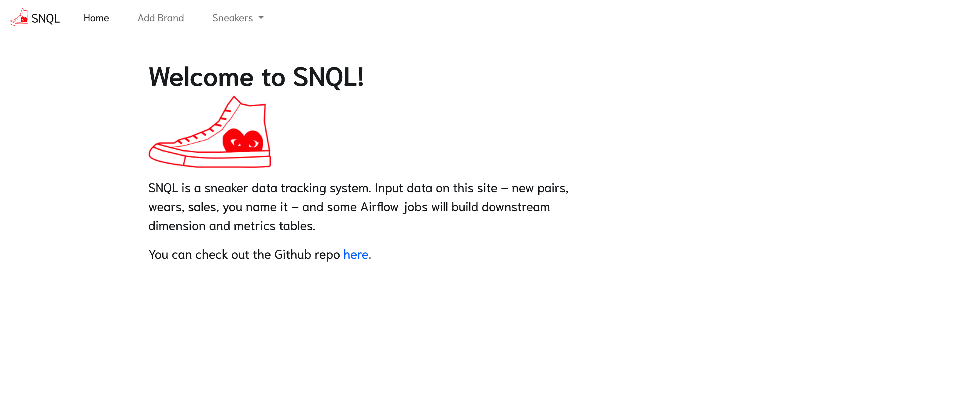 The project starts with a web application that lets the user (me) input sneaker data – like purchases, walks, and cleans – into a form. Backend logic takes that data and does two things: (1) sends a lifecycle event (LCE) to the events table, and (2) updates or creates a record in the sneakers table. Downstream, the data is transformed and loaded into a sneaker dimension table by an Airflow job. That table (and the current view) are the basis for any analytics that you’d want to do later on.