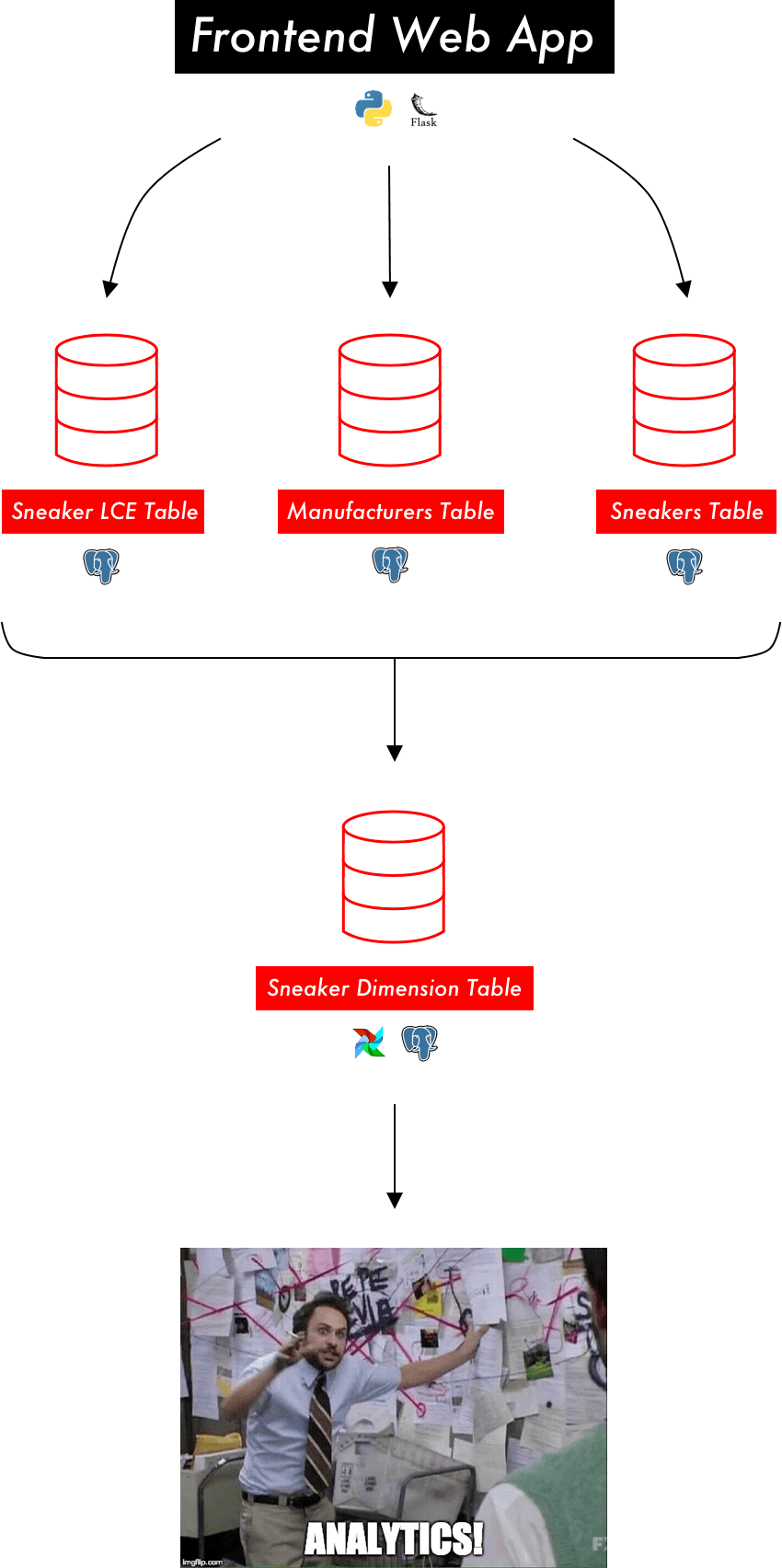 Analytics: this is the end “product” – a series of visualizations and graphs that pull from the sneakers dimension table and answer the original questions that we started with. I use a Javascript framework called D3, and it will need to grab data from the sneakers dimension table on some regular basis (or on page load).